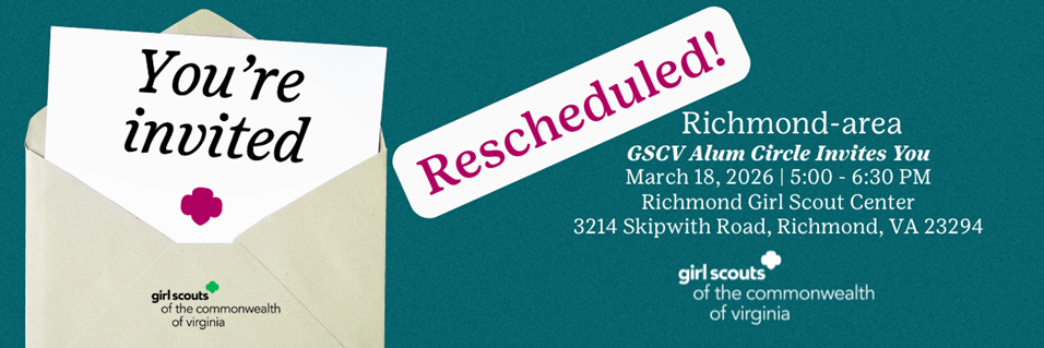 Click below to RSVP to the rescheduled Alum Circle Event Wednesday, March 18, 2026, from 5:00-6:30 pm Girl Scout Service Center 3214 Skipwith Road, Richmond, VA 23294